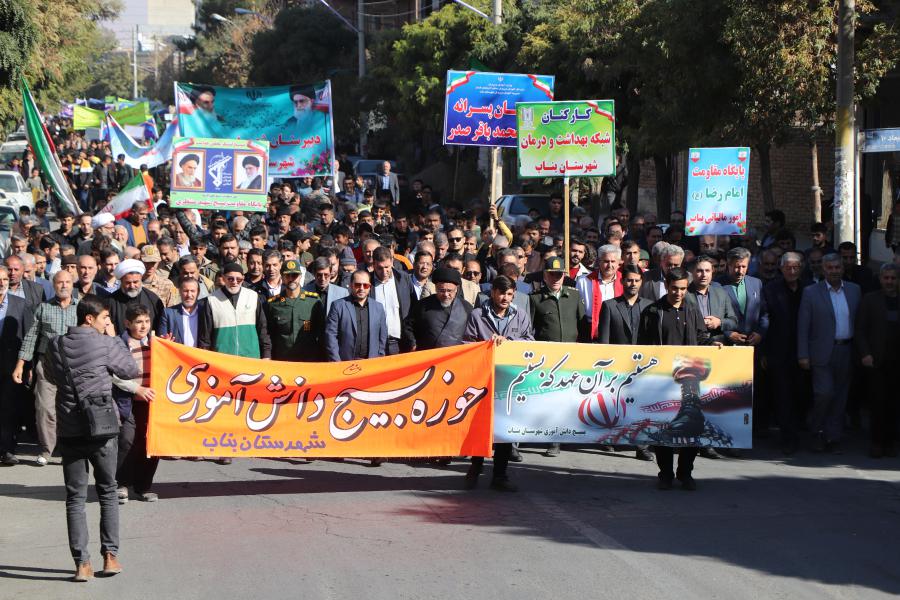 گزارش تصویری مراسم عزاداری فاطمیه اول در سوگ شهادت بانوی دوعالم حضرت فاطمه زهرا سلام الله علیها در مصلای اعظم بناب و فریاد استکبارستیزی طلاب و روحانیون واساتید حوزه بناب به همراه مردم انقلابی و ولایی بناب در راهپیمایی ۱۳ آبان